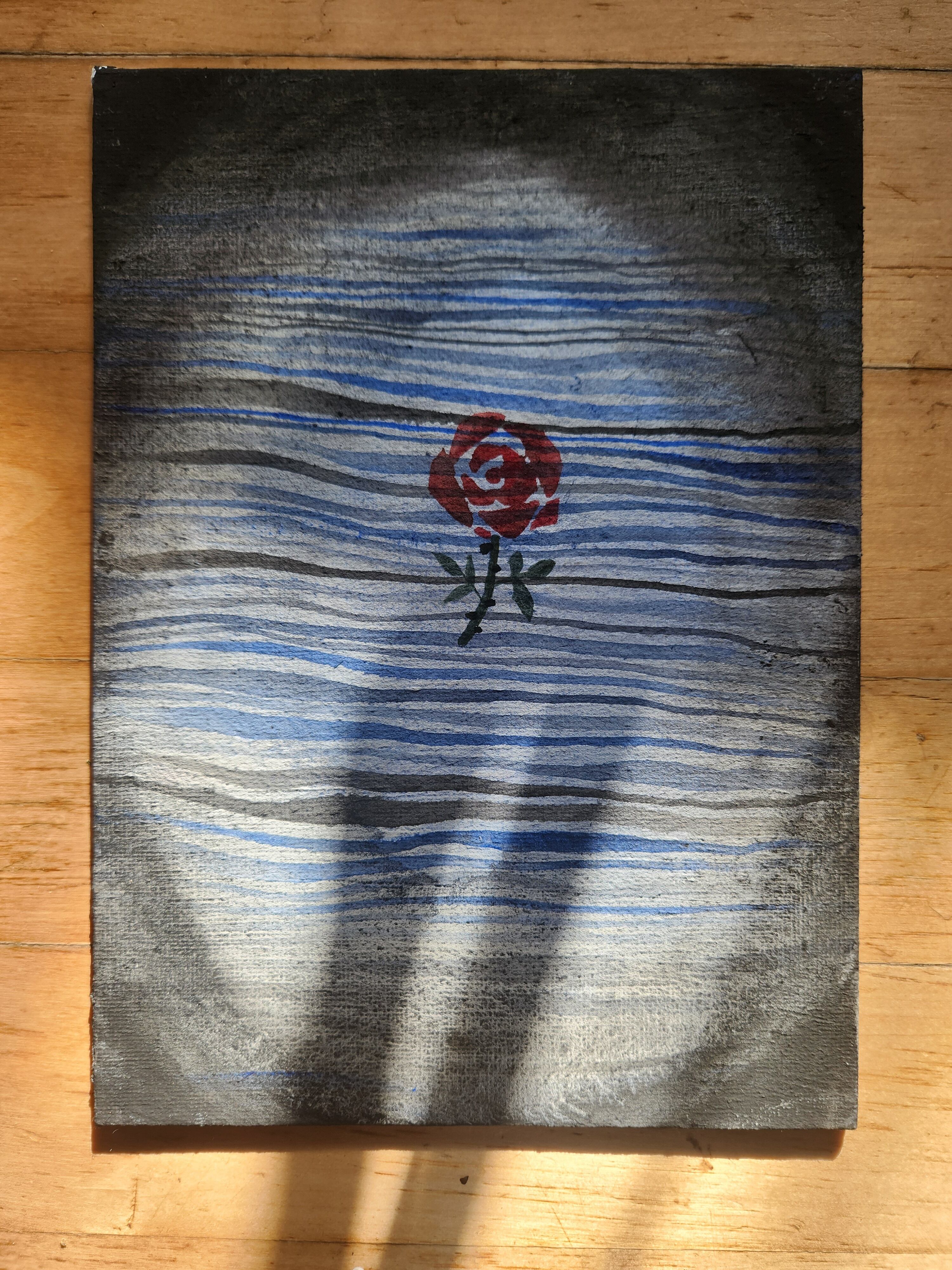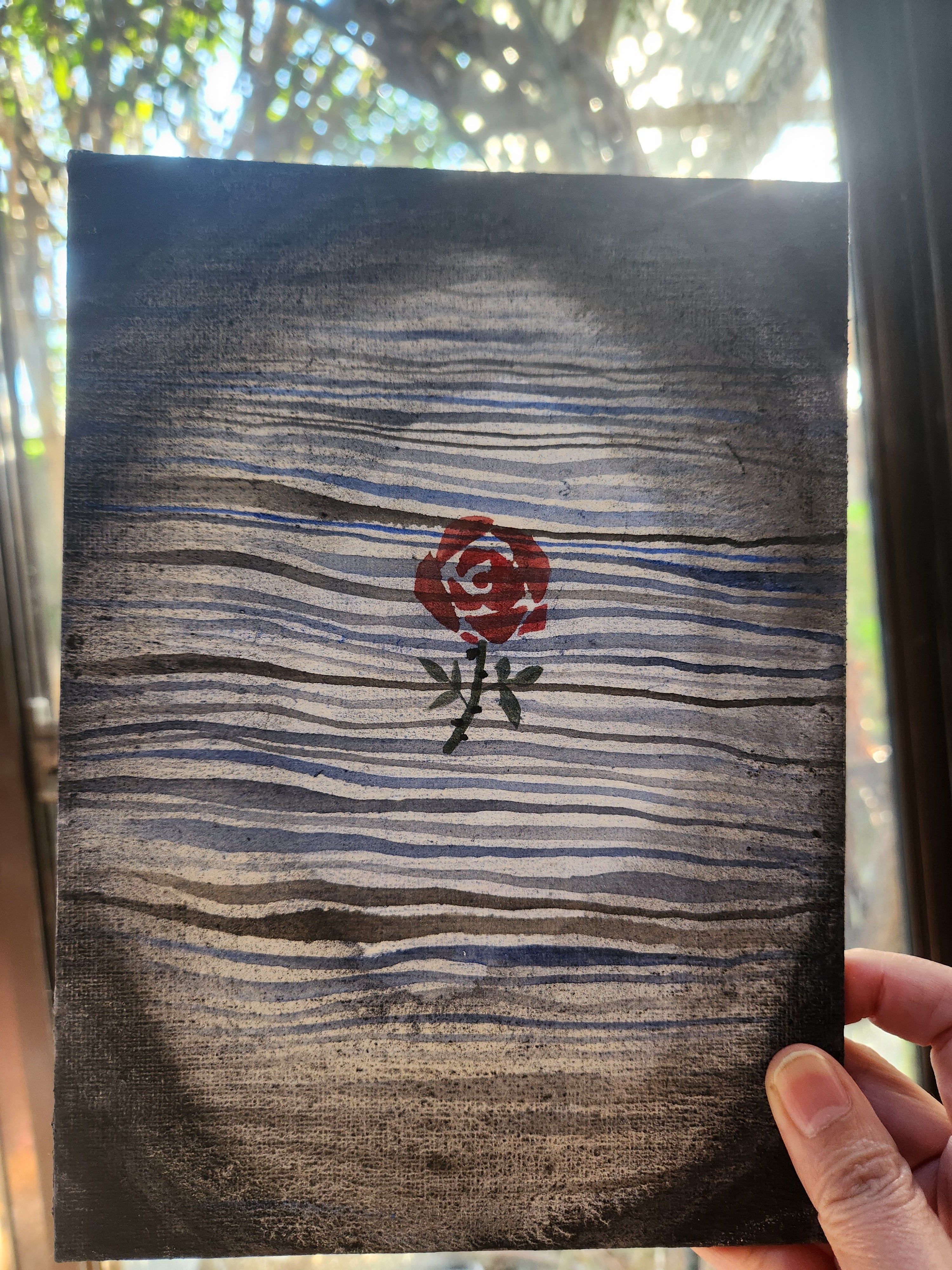 キャンバス地を張った厚紙にアクリル絵の具で描きました。ざらりとした質感が特徴です。小さい作品ですので、一品でもシリーズでも、スペースをとらず飾っていただけると思います。