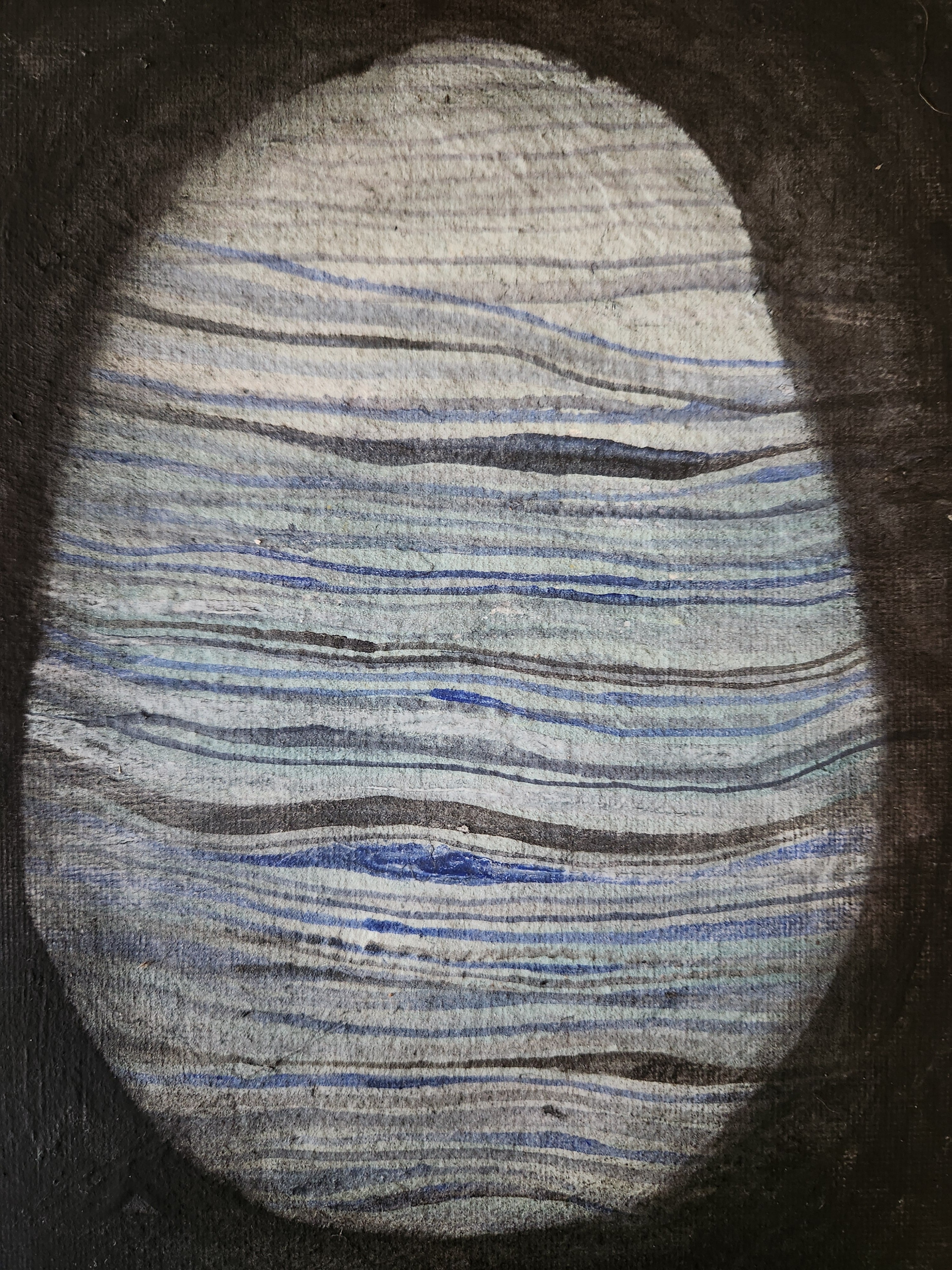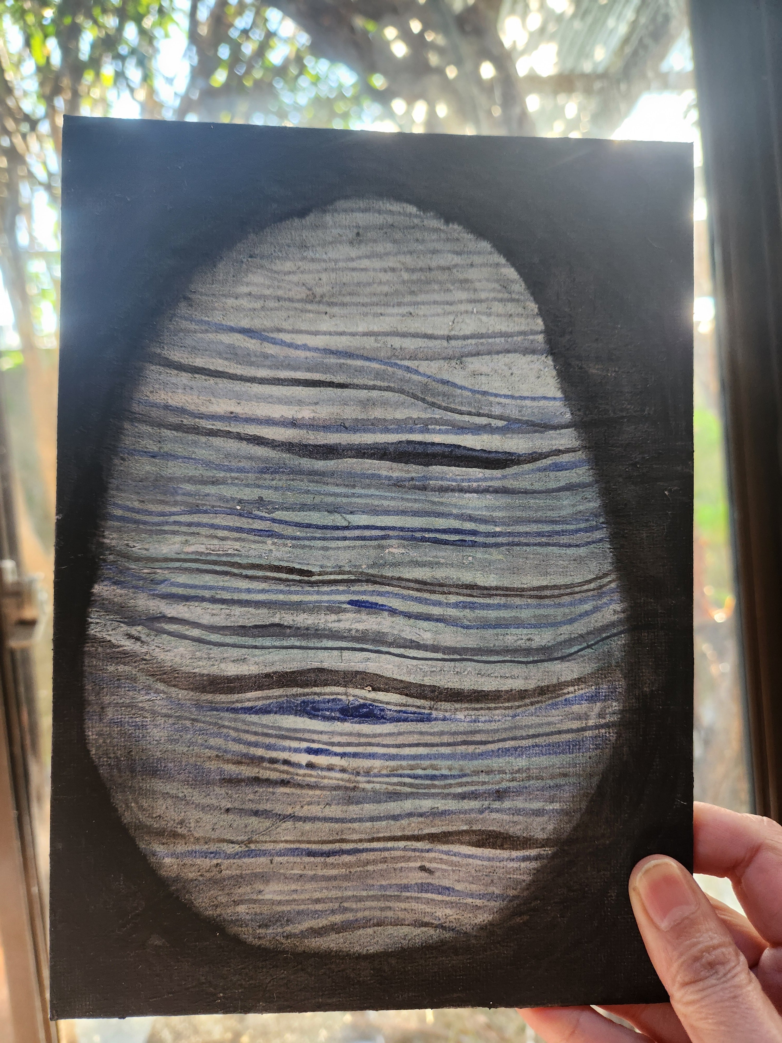 キャンバス地を張った厚紙にアクリル絵の具で描きました。ざらりとした質感が特徴です。小さい作品ですので、一品でもシリーズでも、スペースをとらず飾っていただけると思います。